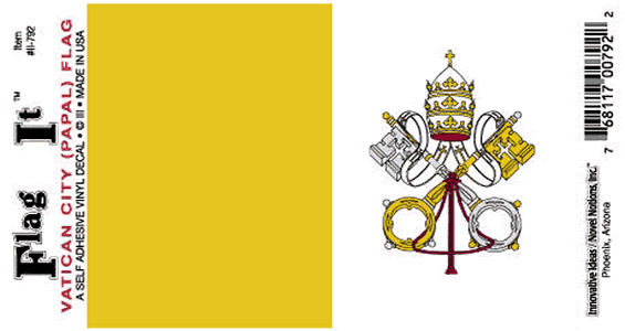 Vatican City Papal Flag Decal. Screen printed with a double pass of inks for quality, printed on thick vinyl stock and laminated with high gloss UV coated laminate, durable enough for outdoor use. Great for cars, trucks, vans, RV's boats, travel trailers, motor homes or any use you want a sticker for. Each decal measures 3.5"x5" in size.